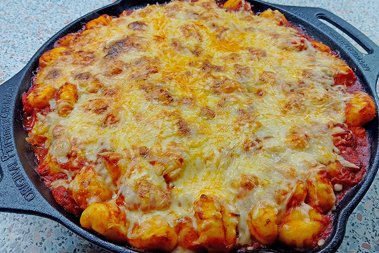 Überbackene Gnocchipfanne gelingt rasch mit diesem Rezept. Das einfache Gericht begeistert die Familie.